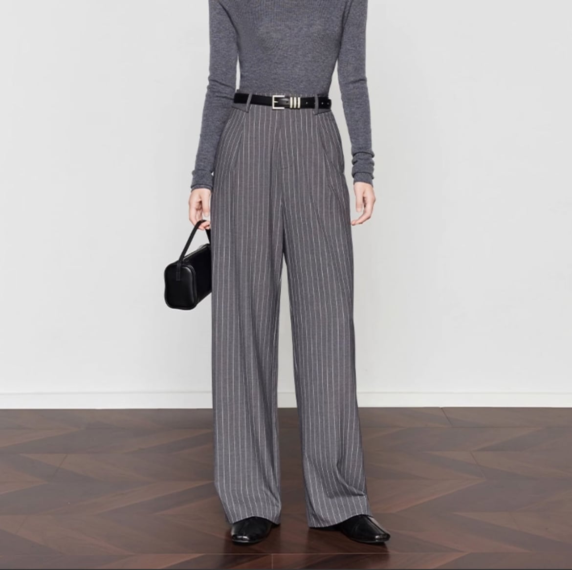 落ち着いたグレーストライプが魅力の 秋冬にぴったりなワイドパンツ。
