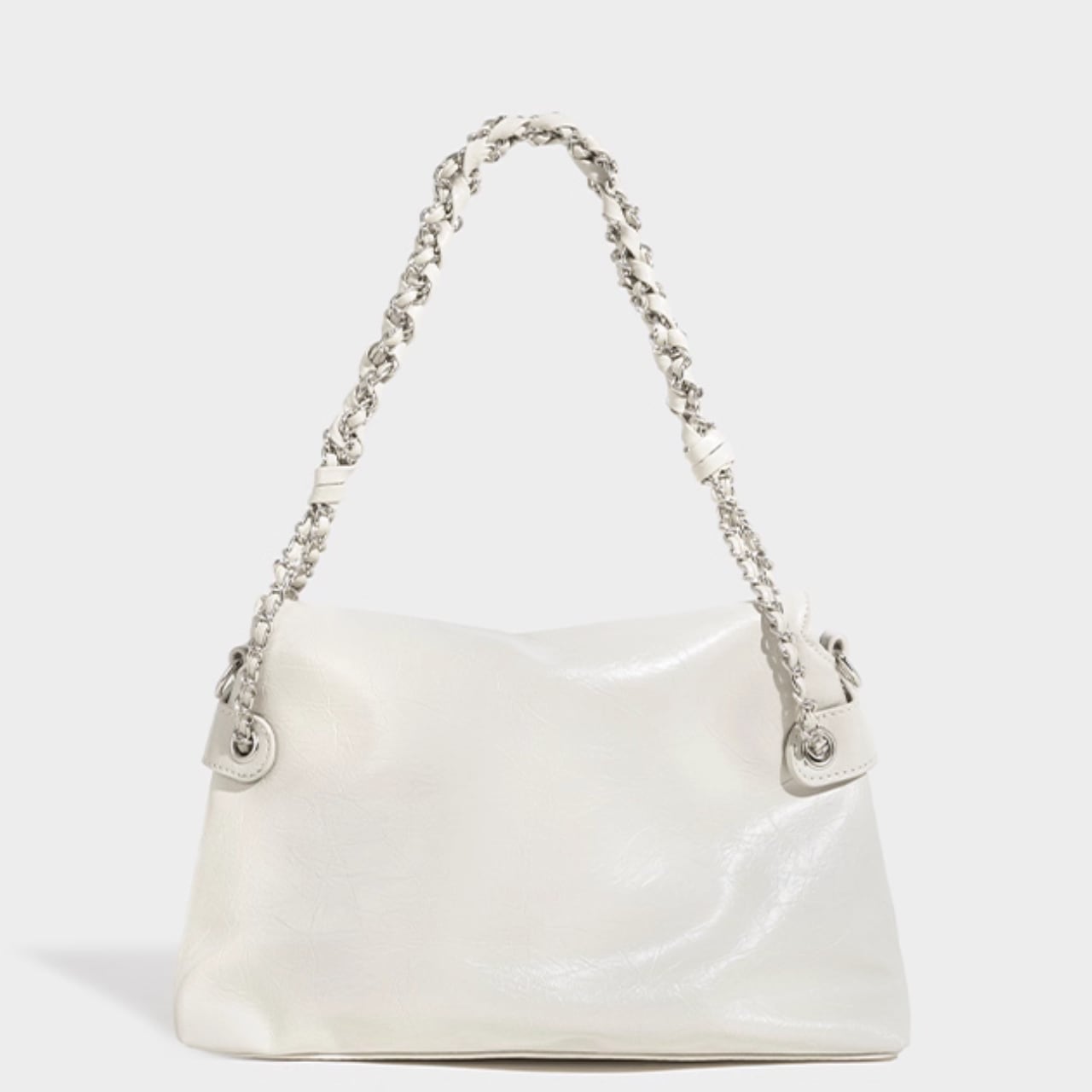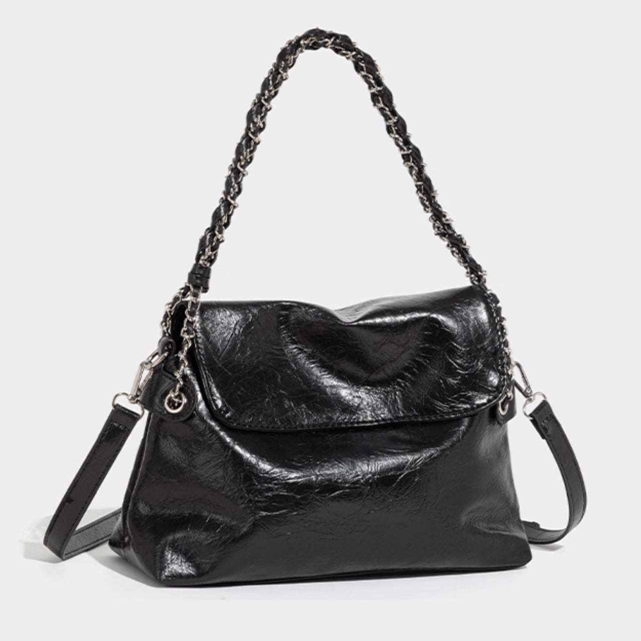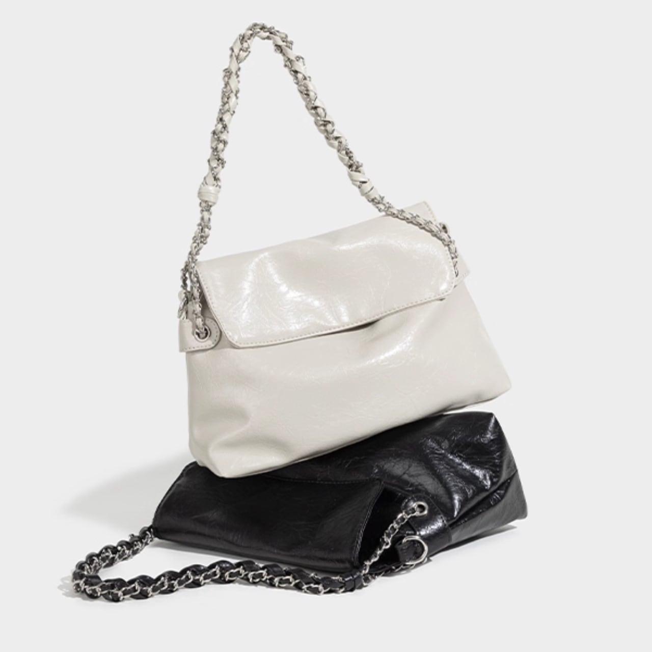黒の艶感がコーデを引き締めるチェーンバッグです。 取り外し可能なストラップ付きで、肩掛けも斜め掛けも自由自在。 ■サイズ 高さ 22cm 底幅 31cm マチ 12cm 持ち手高 18cm 海外製品のため、1-3cm誤差がある場合がございます。 ■カラー ブラック ホワイト