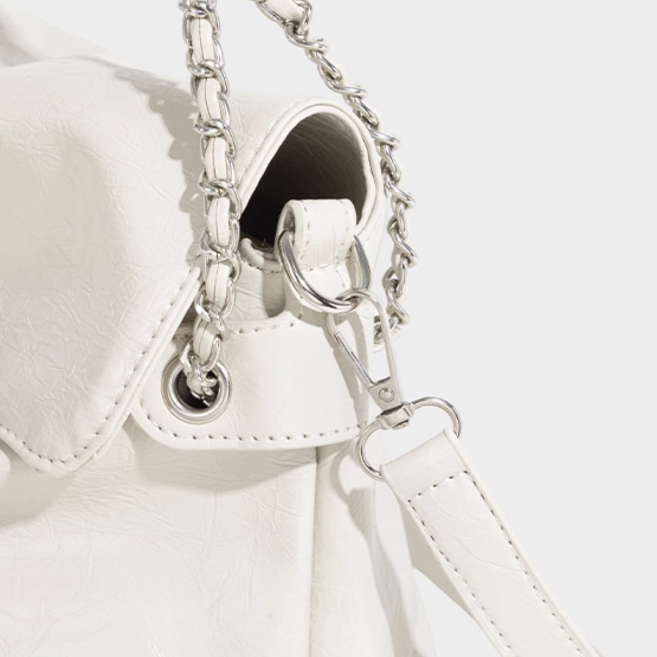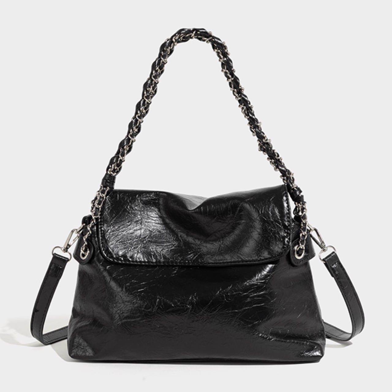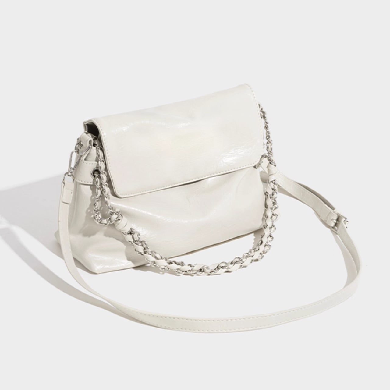 黒の艶感がコーデを引き締めるチェーンバッグです。 取り外し可能なストラップ付きで、肩掛けも斜め掛けも自由自在。 ■サイズ 高さ 22cm 底幅 31cm マチ 12cm 持ち手高 18cm 海外製品のため、1-3cm誤差がある場合がございます。 ■カラー ブラック ホワイト