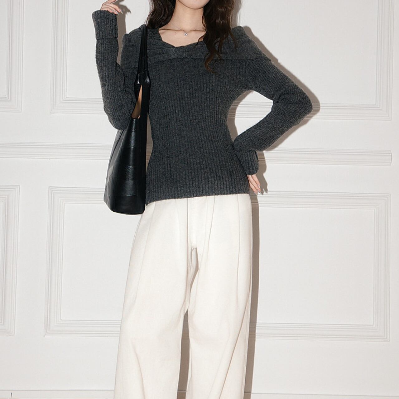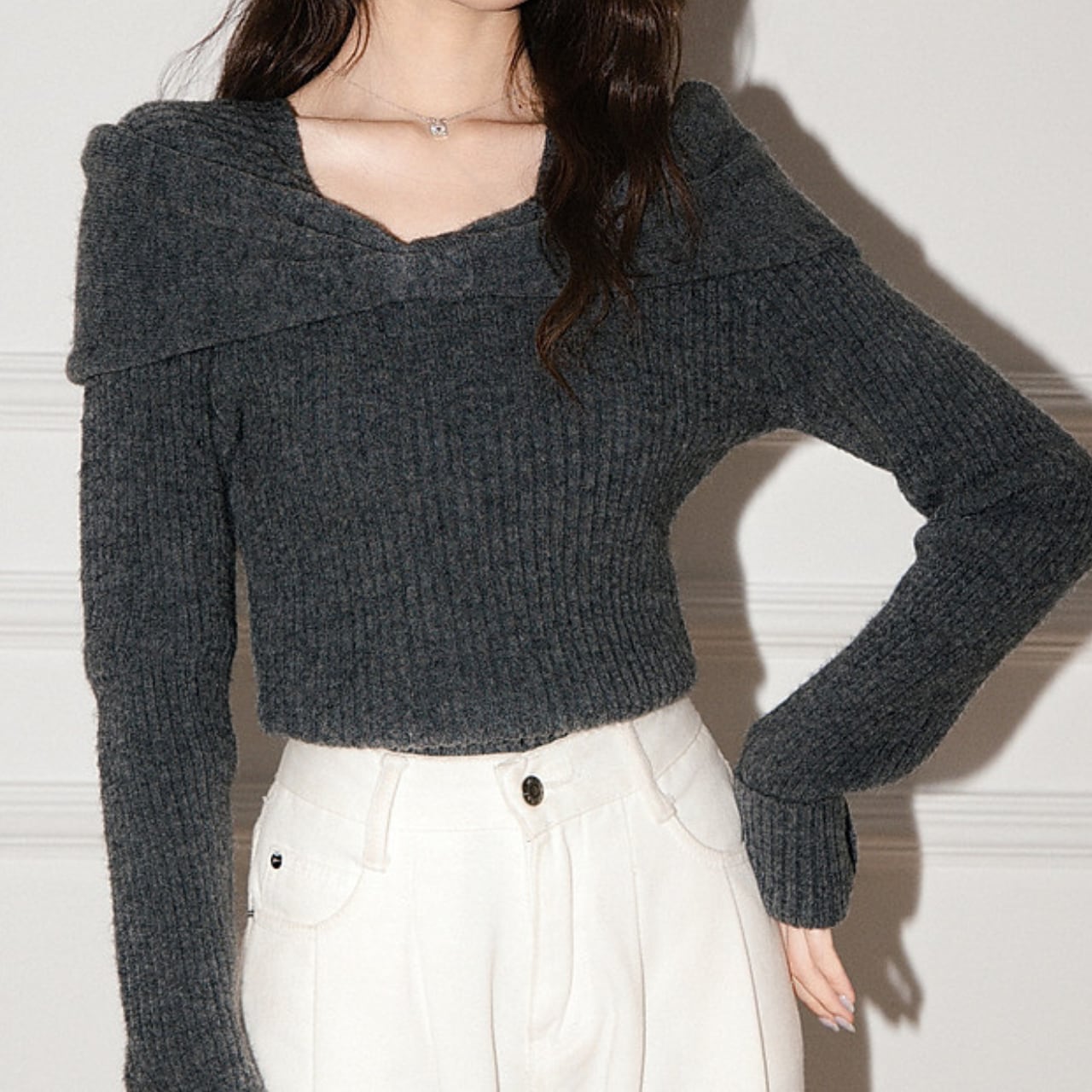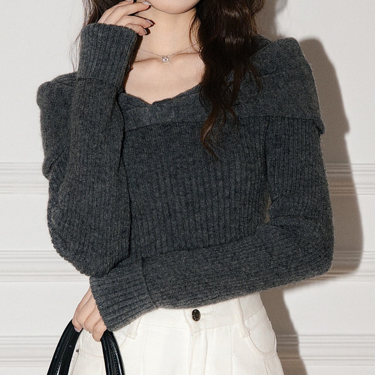 オフショルダーデザインが特徴的なニットです。 デコルテを美しく見せ、女性らしさを引き立てます。 クロップド丈なので ハイウエストのボトムスと合わせてスタイルアップ効果も期待できます。 ■サイズ(単位:cm) S 肩幅:35 胸囲:72 着丈:50 袖丈:68 M 肩幅:36 胸囲:76 着丈:51 袖丈:69 L 肩幅:37 胸囲:82 着丈:52 袖丈:70 海外製品の為1-3cm誤差がある場合がございます。 ■カラー ダークグレー ■素材 ポリアクリロニトリル繊維(アクリル) 42% ポリエステル繊維 30% ポリアミド繊維(ナイロン) 28%